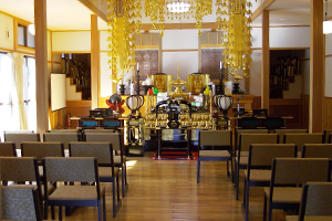 お寺で葬儀、回忌法要をされたいとのご要望にお応えするべく平成十六年に完成いたしました。五十名くらいまでの法要に対応することが出来ます。式場に隣接して大広間もございますので、ごゆっくりしていただけます。