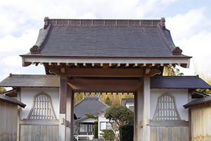 近年、改修された山門。山門は聖と俗との結界の役割を果たしています。上方の欄間には中山伊平次(左甚五郎の高弟とも)の作とされる龍の彫物がございます。