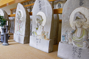 現代のように交通が発達していなかった時代、四国八十八か所や西国三十三か所霊場を巡拝するのは簡単ではありませんでした。そこで、身近な地域でお参りできる「写し霊場」というものがもうけられました。さらには一つのお堂に全ての仏様が集合して、一度にお参りできるものも作られました。この観音堂にもそのような頃に熱心な檀信徒の方が寄進して奉納した三十三体の観音様がおいでになります。