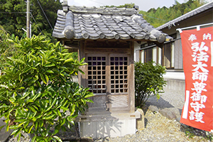 お大師様が四国を巡錫された折、この地を訪れました。 ある朝、通り掛かった馬子に積み荷の塩鯖を分けてくれと仰いますが、口汚くののしられ、断られます。馬子が馬引坂まできた時、 馬が急に苦しみだし、先ほどの坊様への非礼のせいだと気づいた馬子は鯖を持っておわびし、馬の病気をなおしてくれるように頼みました。 お大師様がお加持水を与えると馬はたちまち元気になり、さらに塩鯖をお加持すると生きかえって泳いでいきました。 それを目にして仏心をおこした馬子は、この地に庵をたて古今来世まで人々の救いの霊場としたそうです。