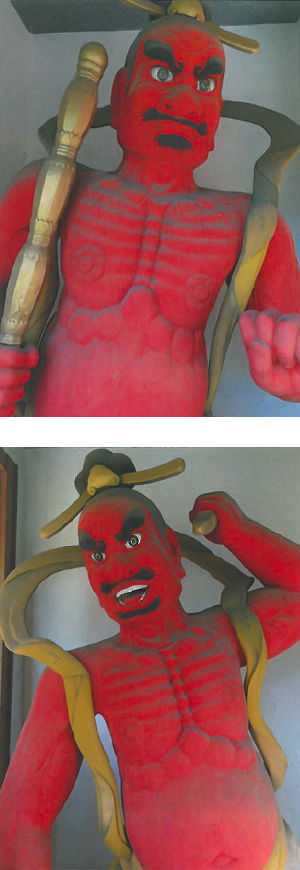 ドウモコウモの家に着くと、本人は不在で、出てきた大女に家の中に通されました。あたたかい静岡からやって来た仁王は、雪が降る唐の国のあまりの寒さに震えていました。それを見た大女が火鉢を片手で軽々と持ってきてくれました。その火鉢を近づけようとした仁王ですが、ぴくりとも動きません。「女でこれではドウモコウモはどんなに力持ちかわからない。こんなところにいると、ドウモコウモに殺されてしまう」と家を抜け出し、一目散に逃げ出しました。海を越え山を越え必死で西山寺まで帰ってきましたが、ドウモコウモはすぐそこまで追いかけてきました。 困った仁王が薬師様に助けを請うと、「池のさるすべりの木にぶらさがっていなさい」と言われます。怖さに震えながら薬師様の言うとおりにしていると、池に映った仁王を見つけたドウモコウモは本物と間違えて池の中にドボン。そこへすかさず薬師様が大きなふたをしました。ドウモコウモは、大暴れをしますが、ふたはびくともしません。ドウモコウモは、「こいつは、ドウモコウモならぬ」とうなって、ぶくぶく沈んでしまいました。